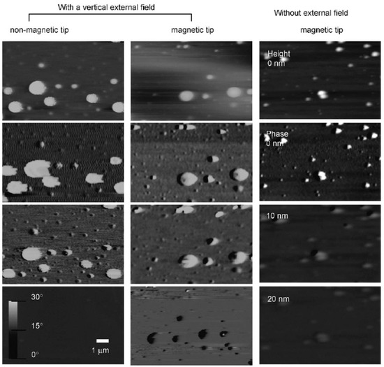 Embedding superparamagnetic iron oxide nanoparticles (SPIONs) in functional thin films is of high interest for nanocomposites as well as for biomedical applications which are discussed in Section 4. However, there is still a need for the high-resolution mapping of the hidden nanoparticles. Magnetic force microscopy (MFM) has proven to be a suitable technique for imaging SPIONs at ambient conditions and providing information about spatial distribution, size, and magnetic behavior in a single pass. MFM enables high-resolution mapping of magnetite nanoparticles of various sizes embedded in polymer films of various thicknesses. A quantification of the magnetic signals is used to determine the size of the magnetic core of the embedded nanoparticles as also shown in Figure 4 [36,74,75]. MFM is also used to detect probe–sample interactions from superparamagnetic nanoparticles in vitro in ambient atmospheric conditions. By using both magnetic and nonmagnetic probes in dynamic lift-mode imaging and by controlling the direction and magnitude of the external magnetic field applied to the samples, it is possible to detect and identify the presence of superparamagnetic nanoparticles (see Figure 5) [76,77,78,79]. Magnetic dichroism in the high-energy spectroscopies has opened new opportunities for the spatially resolved investigation of the magnetic microstructures. Involving characteristic electronic levels of the solid, soft X-ray magneto-dichroic effects combine the magnetic sensitivity with elemental selectivity and, correspondingly, permit element-specific analyses of magnetic phenomena. Of particular interest is their use as a contrast mechanism in magnetic domain imaging [7]. Magnetic hysteresis measurements on heteromagnetic materials are of interest. Dramatically different Fe and Co hysteresis curves of Fe/Cu/Co trilayers were obtained by recording the magnetic circular dichroism at their respective L3 white lines as a function of applied magnetic field [80].