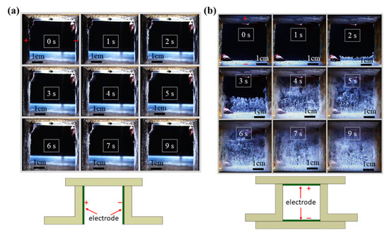 Sequential images of the evolution of gas bubbles on the surface of platinum electrodes that are placed in (a) a vertical and (b) a horizontal layout without a magnet (voltage: 200 V; electrode distance: 5 cm).