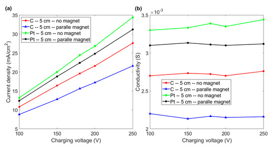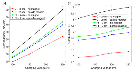 (a) Current density vs. charging voltage for graphite and platinum electrodes with and without a magnet for an inter-electrode distance of 2 cm. (b) Conductivity vs. charging voltage for the various experimental layouts in Figure 6a.