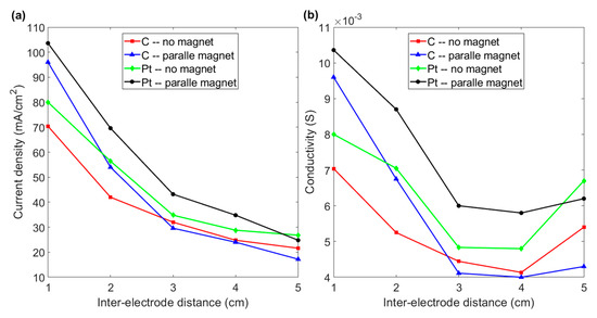 (a) Current density vs. inter-electrode distance for graphite and platinum electrodes with and without a magnet for various inter-electrode distances. (b) Conductivity vs. inter-electrode distance for the various experimental layouts in Figure 7a: the charging voltage is 200 V.