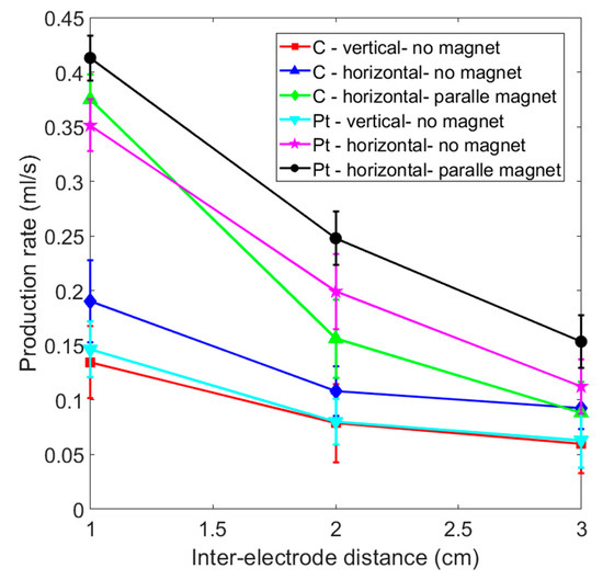 Figure 8 shows a comparison of gas production efficiency for paramagnetic and diamagnetic electrodes using inter-electrode distances of 1 to 3 cm. The production rate increases if the distance between the electrodes is reduced. If no magnetic field is applied, the vertical platinum electrode features almost the same gas production as a vertical graphite electrode for each inter-electrode distance. Table 1 shows the efficiency comparison for the accumulation of 20 mL of hydrogen for each case shown in Figure 7 and Figure 8. The “+” sign indicates the optimal efficiency for the identical electrode material in different layouts. The “++” sign represents the best production efficiency for various materials and layouts with the same inter-electrode distance. Paramagnetic platinum electrodes that are placed horizontally and subjected to a perpendicular magnetic field produce gas most efficiently under the various experimental conditions. On the other hand, graphite electrodes with a horizontal placement that face a magnet may generate more gas than a platinum electrode without a magnet for an inter-electrode distance of less than 1 cm.