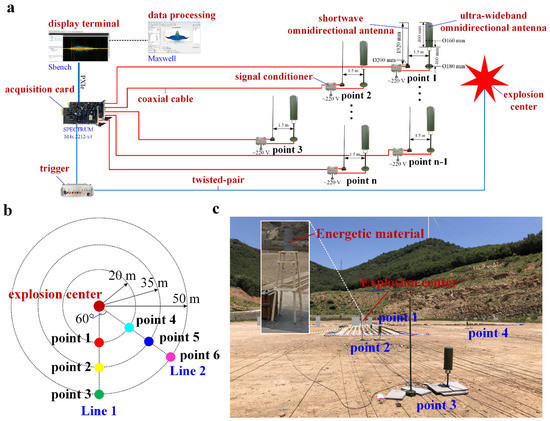 According to the theoretical analysis of blasting mechanics, combined with the quantity of explosives used in the experiment, an electromagnetic radiation measuring device was designed, which is shown as Figure 1a. The test point consisted of a short-wave passive omnidirectional antenna, an ultra-wideband passive omnidirectional antenna, a signal amplifier, and a limiter. The short-wave passive omnidirectional antenna was a monopole antenna with a height of 2000 mm, a sampling frequency of 1–30 MHz, and the output impedance was 50 Ω. The ultra-wideband omnidirectional antenna was a dipole antenna with a height of 450 mm and a sampling frequency of 30–1.5 GHz; the output impedance was 50 Ω. The signal conditioner possessed multiple functions including a combiner, a signal amplifier, and a limiter, which can combine two electromagnetic signals of different frequencies and amplify the signal at the same time with a range of amplification factors of 10–30 dB. The function of the limiter with limiting power greater than 10 W was to prevent the signal power from being excessively high and damaging the acquisition card. The test point was connected to the data acquisition card through wideband coaxial cable, and the high-speed acquisition card was used to record the data. The maximum sampling rate was set to 3 GSa/s, the electromagnetic signal with the highest frequency of 1.5 GHz was collected on the basis of the Nyquist sampling law, which matched the frequency bandwidth of the antenna. The sampling duration was set to 810 ms, so the sampling duration before the trigger was 10 ms, and the sampling duration after the trigger was 800 ms [17,18,19,20,21]. As shown in Figure 1b, there were six test points in the distribution diagram. Points 1, 2, and 3 formed Line 1, which were, respectively, 20, 35, and 50 m away from the explosion center. Points 4, 5, and 6 formed Line 2; the distance from the explosion center was 20, 35, and 50 m, respectively. The angle between Line 1 and Line 2 was 60 degrees. The measuring equipment was placed according to the distribution shown in Figure 1b, and the electromagnetic radiation measurement experiment field is shown in Figure 1c.