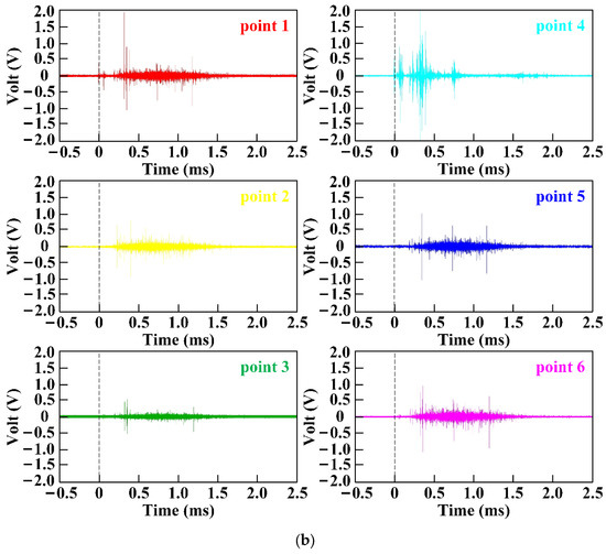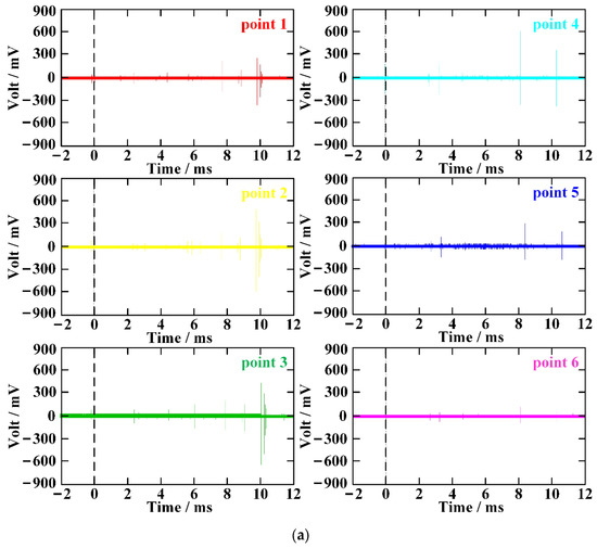 The time-domain characteristics of electromagnetic radiation included parameters such as the duration of the sampling period, the delay response time, and the peak arrival time [22]. In this study, a total of two effective experiments were carried out, and the electromagnetic signals of 30 kg and 60 kg TNT explosives were measured, respectively. Each group of experiments included the signals of six channels, and each channel corresponds to the test points 1–6. The electromagnetic radiation signal generated by the explosion of 60 kg TNT is shown in Figure 3a, and the time-domain distribution of the electromagnetic signal of each adopted channel is shown in Figure 3b. The electromagnetic radiation signal generated by the explosion of 30 kg TNT is shown in Figure 3c, and the time-domain distribution of the electromagnetic signal of each adopted channel is shown in Figure 3d. As shown in Figure 3, the time-domain distribution of the 60 kg TNT electromagnetic pulse was denser, which indicated that the mass of the energetic material had an important influence on the duration of the electromagnetic radiation generated by the explosion. The greater the mass, the longer the duration of the electromagnetic signal. The time-domain distribution of the electromagnetic signals measured by each test point was regular, the electromagnetic signal measured by the test points far from the explosion center had a shorter duration, and the time domain distribution of the electromagnetic pulse was also scattered.