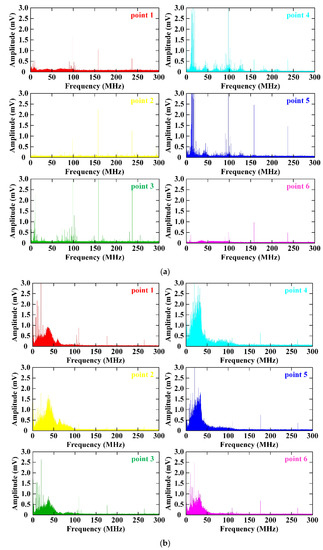 The spectral distribution of electromagnetic radiation was an important parameter in the electromagnetic signal analysis, and the electromagnetic radiation signal was processed using Fourier transform with a Hanning window. The electromagnetic radiation spectrum of TNT explosion is shown in Figure 6. The frequency distribution of electromagnetic radiation of 30 kg TNT is shown in Figure 6a, and the frequency distribution of electromagnetic radiation of 60 kg TNT is shown in Figure 6b. The frequency of the electromagnetic radiation signal generated by the 30 kg TNT explosion is mainly concentrated in the low frequency band of 0~20 MHz and around 100 MHz. The frequency of the electromagnetic radiation signal generated by the explosion of 60 kg TNT is mainly concentrated in 0–100 MHz. The greater the mass of the explosive, the greater the frequency distribution of the electromagnetic radiation signal generated by the explosion, and the more concentrated the energy. The spectrum distribution of different test points is quite different, and the spectrum distribution of test points closer to the explosion center is more obvious, and they are distributed in the range of 0~100 MHz. The spectral distribution of the test points far from the explosion center is weak, and the electromagnetic radiation spectrum is mainly concentrated within 50 MHz. The electromagnetic radiation generated by the explosion of the same mass of explosives, the closer the distance to the detonation center, the larger the frequency distribution range of the electromagnetic signal. In addition, there are obvious differences in the electromagnetic frequency distribution in different directions, indicating that the electromagnetic radiation spreads unevenly.