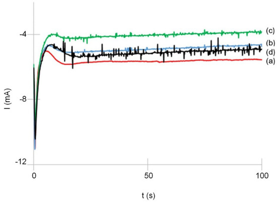 Potentiostatic current transients for the deposition of CaP coatings at −1.55 V/AgAgCl under (a) B = 0 T, (b) B = 6 T┴J, (c) B = 12 T┴J, and (d) 16 T┴J, during the first 50 s.