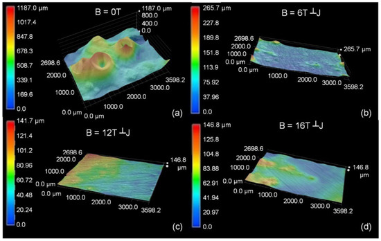 Surface topography of calcium phosphate electrodeposited under (a) B = 0 T, (b) B = 6 T┴J, (c) B = 12 T┴J, (d) B = 16 T┴J.