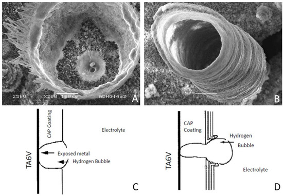(A,B) SEM images and schematic of volcano-like craters built-up on calcium phosphate coatings that are electrodeposited at E = −1550 mV/AgAgCl under B = 0 T. (C,D) Schematized hydrogen bubble evolution and craters formation.