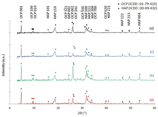 Calcium phosphates (CaP) are biomaterials that are usually used as coatings of biometals for dental implants and prostheses [1]. There is interest in studying such materials because of their ability to chemically bond to bones. The calcium orthophosphates family constituents include hydroxyapatite (HAP, Ca10(PO4)6 (OH)2) with a Ca-to-P ratio equal to 1.67 and octacalcium phosphate (OCP, Ca8H2(PO4)6 5H2O) with a Ca-to-P ratio equal to 1.33. OCP has been confirmed as a bone substitute material that enhances bone regeneration [2]. Osteoconductivity can be improved if the synthetic hydroxyapatite is closer to that of a bone mineral in crystal structure, size, and morphology [3].