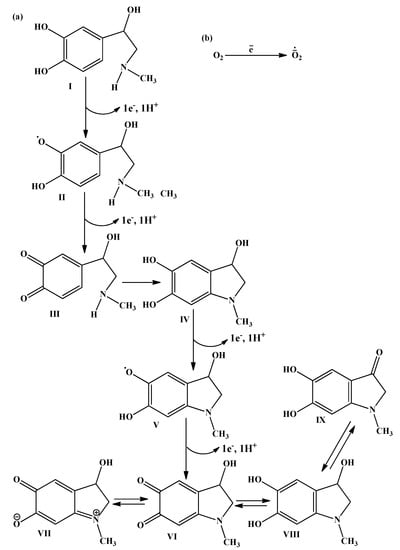 - Sirota, T. A chain reaction of adrenaline autoxidation is a model of quinoid oxidation of catecholamines. Biophysics 2020, 65, 548–556. [Google Scholar] [CrossRef]