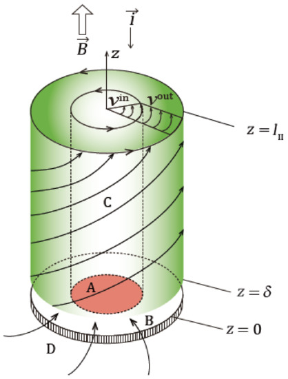In an electrode reaction under a vertical magnetic field, as shown in Figure 2, a macroscopic tornado-like rotation called the vertical magnetohydrodynamic (MHD) flow (VMHDF) emerges over a disk electrode with a fringe (fringed vertical MHD electrode (fringed-VMHDE)). In the preceding papers [5,6], the processes of the MHD rotation and the resulting mass transfer have been clarified. The electrode surface is covered with ionic vacancies, providing a free surface without friction. A fringed-VMHDF is divided by an upper rotational layer and a lower radial flow layer. The rotation of the upper layer is driven by the Lorentz force, and the radial flow arises from the pressure difference on the fringe of the electrode. By removing the fringe, we will find only a rotating piston-like flow without the radial flow layer.