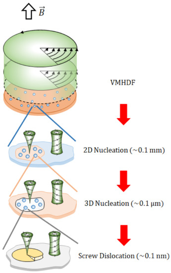However, several important problems are still open to us; the scale of the length of a VMHDF (~1 mm) is 107 times as large as that of a screw dislocation (~0.1 nm). The first question is—how are such chiral screw dislocations created by the rotation of the VMHDF despite extremely different scales of length? (Q1). Generally, nucleation in electrodeposition is classified into 2D nucleation of the order of 0.1 mm, 3D nucleation of the order of 0.1 μm, and screw dislocations of the order of 0.1 nm. Therefore, the emergence of the chiral activity would be composed of the three generations of chiral nuclei, i.e., chiral 2D nucleus, chiral 3D nucleus, and chiral screw dislocation. A chiral screw dislocation is created on a chiral 3D nucleus, which in turn grows on a chiral 2D nucleus developing under a VMHDF. These three processes form a nesting-boxes structure. As will be clarified later, based on a simple evidence, the fact that the chiral activity arises from the three generations is validated from both theoretical and experimental aspects. As for 2D and 3D nuclei, the nucleation processes under parallel magnetic fields have been established [20,21,22,23], so in the present papers, we should examine how chiral 2D and 3D nuclei emerge under VMHDF rotations.