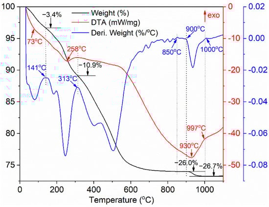Figure 1 presents the TG-DTA-DTG curves of the as-synthesized precursor. The values consisting of a DTG curve are from the first derivative of the TG curve, which can help to clearly distinguish each thermal decomposition stage. The thermal decomposition process of the precursor with the total weight loss of 26.7% can be divided into four main stages. The weight loss of about 3.4% below 141 °C is derived from the removal of residual ethanol, absorbed water and partial crystallized water, and the endothermic peak is centered at about 73 °C. The weight loss of 7.5% in the second stage from 141 to 313 °C is ascribed to the removal of ammonium radical and the dehydration, and the endothermic pick located at 258 °C is mainly assigned to the dehydration of the O-H groups and the removal of residual water. The weight loss of about 15.1% between 313 and 900 °C is the result of the further dehydration of the O-H groups and the decomposition of carbonate. No significant weight loss happens between 850 and 900 °C, implying that the precursor has almost decomposed into terbium oxide and mainly in the form of TbO1.714 (Tb7O12) phase [45]. There is a slight weight loss about 0.7% between 900 and 1000 °C, deriving from the decomposition of sulfate as well as the deoxidization reaction of terbium oxide from TbO1.714 to TbO1.5 according to Ref. [45], and the corresponding endothermic peak is situated at near 930 °C. No obvious weight loss is observed above 1000 °C, presenting that the carbonate and sulfate in the synthesized precursor have been decomposed completely after 1000 °C.