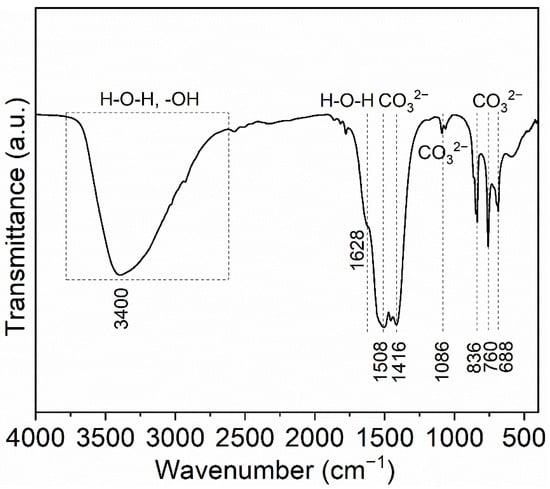 Figure 2 shows the FTIR spectrum of synthesized precursor. The precursor shows a wide absorption band from 3700 to 2640 cm−1 and centered at about 3400 cm−1, which is relevant to the stretching vibration of free OH− groups (about 3000–3700 cm−1) and the bending vibration of H-O-H from the molecules water in the precursor (symmetric ν1 and anti-symmetric ν3, 3200–3500 cm−1) [48]. The 1628 cm−1 shoulder is originated from the bending mode (ν2) of the H-O-H [49]. These peaks at 1508, 1416, 1086, 836, 760 and 688 cm−1 are all bound up with the existence of CO32−. Two absorption peaks in the regions of 1508 cm−1 (asymmetric ν3) and 1416 cm−1 (symmetric ν3) are defined as the stretching mode of the C-O bond in CO32− groups [50]. The splitting at this band can be ascribed to carbonate ions located at a crystallographically non-equivalent site [51,52]. The peak centered at 1086 cm−1 is characteristic of the ν1 symmetric stretch of CO32−, which may overlap the weak peak of SO42− located at about 1100 cm−1. These peaks at 836, 760 and 688 cm−1 are assigned to the δ out-of-plane bending vibration, ν3 and ν6 vibration of CO32−, respectively [52,53]. Based on the above analysis, the precursor is the terbium hydroxycarbonate with crystal water [53].