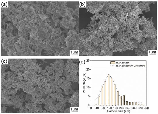 Figure 4 displays the FESEM micrographs of the as-synthesized precursor, the calcined powder and the Tb2O3 powder. The precipitated precursor presents a two-dimensional needle or flake structure with a thickness of several nanometers and a length of several hundred nanometers, as shown in Figure 4a, and the precursor is relatively loose and slightly agglomerated. After heat treatment, the morphology of the powder changes greatly, and the precursor is fully collapsed into the uniform particles. The air calcined powder and Tb2O3 powder after reduction treatment have the similar morphologies and consist of near-spherical primary particles. It is noticed that sintering necks appear between powders, implying that a slight sintering phenomenon occurs between powders. According to the FESEM micrograph in Figure 4c, the particle size of the Tb2O3 powder is roughly counted, and the particle size distribution can be appreciated more quantitatively in Figure 4d. It can be figured out that the Tb2O3 powder shows a narrow particle size distribution. The particle size of the obtained Tb2O3 powder is principally distributed in the range of 60–180 nm, in which the range of 100–120 nm accounts for the largest proportion. The obtained Tb2O3 powder with the average particle size of about 135 nm and a unimodal particle-size distribution helps to realize the uniform densification and reduce the coordination number of pores during the ceramic sintering process, and it is instrumental in the preparation of transparent ceramics with high quality.