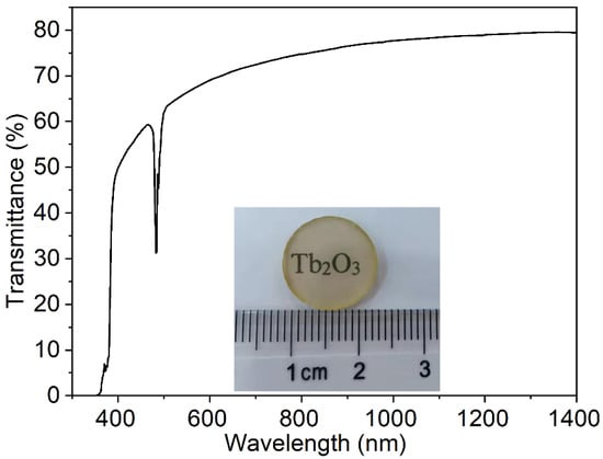 Photograph and in-line transmission curve of the synthetic Tb2O3 ceramics (thickness = 1.0 mm).