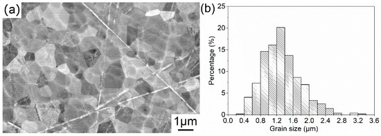 Figure 6 shows the microstructure of the Tb2O3 transparent ceramics and the grain size distribution. It is discovered that the Tb2O3 ceramics consist of uniform grains with different crystal orientations, and no secondary phase or abnormal growth is observed. There are a very few intergranular closed pores of nano-size seated at the trigeminal grain boundaries, which lead to the slight reduction in the in-line transmittance in the visible range. The grain boundaries are very clear and clean. It is also notable that the polishing post-treatment for the Tb2O3 ceramics is a bit rough, and there are many scratches on the polished surface of the Tb2O3 ceramics, which also bring out the decrease in the measured values of in-line transmittance. The grain size distribution and the cumulative percentage are displayed in the histogram in Figure 6b. Statistical values of the grain size of Tb2O3 ceramics predominantly range from 0.8 to 1.6 μm with the largest proportion range being 1.2–1.4 μm. The statistic average grain size of the Tb2O3 ceramics is approximately 1.3 μm, which is far smaller than the reported values.