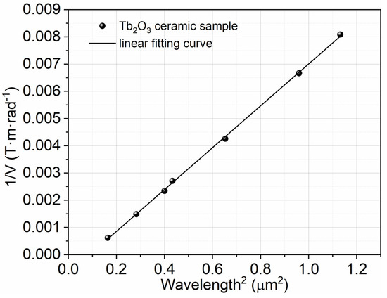 The inverse of the Verdet constant as a function of λ2 for the Tb2O3 ceramics is plotted in Figure 7 in light of Equation (3). There is an apparent positive linear correlation between 1/V and λ2, according to Figure 7, which is consistent with the Van Vleck–Hebb single oscillator model in the visible and near-infrared range. The effective transition wavelength λ0 of the Tb3+ ion and the wavelength independent constant a for the Tb2O3 ceramics are obtained by fitting the experimental results in Table 1 (the absolute values of the Verdet constant at different wavelengths). The effective transition wavelength λ0 is approximately 299 nm, corresponding to the 4f8→4f75d transition of the Tb3+ ion. λ0 can marginally change in different materials in theory, which is due to the fact that the energy levels of the rare-earth ions differ in different materials. The coefficient a is fitted to be 0.00769 (T·m)/(rad·µm2) with the matching factor R2 equal to 0.999 for Tb2O3 ceramics in this work, which is within the range of linear behavior.