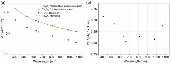 Wavelength dependence of Verdet constant of Tb2O3 ceramics (green dot and red circle) and TGG single crystal (black circle) [58] (a), V(Tb2O3)/V(TGG) ratio versus wavelength (b).