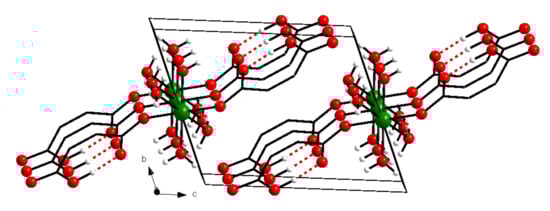 The title complex was first prepared by Gupta in 1984 [], and its molecular structure is shown in Figure 1a. It crystallizes in a triclinic centrosymmetric P-1 space group, and the unit cell of the complex is depicted in Figure 1b. The central Ni(II) atom is coordinated by six oxygen atoms, while four in the equatorial plane originated from molecules of four aqua ligands. There are two hydrogen maleato ligands (Hmal) in the axial position, and they are coordinated through an oxygen atom of a deprotonated carboxyl group. The negative charge -1 of Hmal ligands compensates for the positive charge of the central Ni(II) atom. Axial Ni–O(Hmal) bond distances are 2.078(1) Å, while equatorial Ni–O(aqua) bond distances are 2.025(1) Å and 2.089(1) Å. All O–Ni–O bond angles ranged from 92.45(8)° to 96.73(10)° []. The crystal structure is stabilized by strong intramolecular hydrogen bridges involving the non-deprotonated carboxyl groups of Hmal ligands (Figure 2).