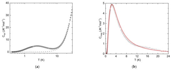 The temperature dependence of specific heat of NiHmal in a zero magnetic field is shown in Figure 3a. The round maximum of specific heat in a zero magnetic field can be observed at a temperature of 2.5 K; a monotonous increase was observed at higher temperatures. NiHmal is a magnetic insulator, which means that the total heat capacity is given by the sum of the specific heat of the magnetic and lattice subsystem. In the temperature range from 10.12 K to 26.3 K, the total specific heat can be approximated by the following expression: