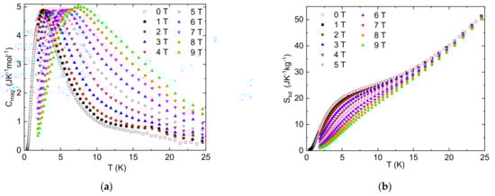 The temperature dependence of the specific heat of NiHmal in non-zero magnetic fields up to 9 T is shown in Figure 4a. It can be concluded that with the increase in the magnetic field, the maximum of the specific heat shifts toward higher temperatures. In contrast, the maximum value of the specific heat remains constant up to a magnetic field of 4 T. At higher magnetic fields, an increase in the maximum value of Cmag is also observed.