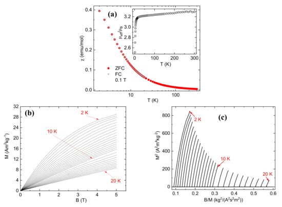 To evaluate the magnetocaloric properties of the NiHmal system, the field dependences of magnetization were measured in magnetic fields up to 5 T in the temperature range from 2 K to 20 K (Figure 5b). For each temperature, the magnetization increases with increasing magnetic field and decreases with increasing temperature at a constant field. Based on this behavior, predicting a normal magnetocaloric effect in the given system is possible. The Arrott plot for the NiHmal powder sample is shown in Figure 5c. It is evident that the qualitative slope of all curves is similar, and the curves do not show linear behavior for any temperature. Thus, no transition to the magnetically ordered state could be seen from Arrott plots, which is consistent with the results from the specific heat data.