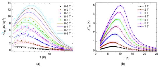The magnetocaloric effect (MCE) remains at the center of attention of several scientific communities in recent times [,,,,,,,,,,,]. MCE is based on the heating or cooling of the magnetic refrigerant if a magnetic field is applied. MCE can be used in magnetic cooling at room temperature when it replaces cooling based on adiabatic gas compression and expansion [,]. On the other hand, MCE can also be used to achieve low temperatures, which are currently mainly obtained on the basis of the physical properties of the helium-3 isotope. Two parameters are essential for evaluating the magnetocaloric properties of a potential magnetic refrigerant: the magnetic entropy change ΔSM when a magnetic field is applied, and the adiabatic temperature change ΔTad when the magnetic field changes in adiabatic conditions [,]. It is important to note that the values of the mentioned parameters should be as large as possible in the given temperature range in which the magnetic refrigerant is used.
