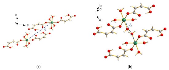 As shown above, the simple S = 1 model only considers the parameters of uniaxial anisotropy D and rhombic anisotropy E, which fairly describes the zero-field specific heat of NiHmal and underestimates its isothermal change of magnetic entropy. Therefore, ab initio calculations of the single-ion anisotropy parameters and BS DFT calculation of possible exchange interactions in NiHmal were performed using the structural data obtained in Ref. [] in ORCA. The single-ion anisotropy parameters of Ni(II) ions in an isolated molecule of NiHmal were predicted using the SA-CASSCF/NEVPT2 method as D/kB = −9.85 K and E/kB = −1.85 K (E/D = 0.188) with diagonal g-tensor components 2.224, 2.240, and 2.279 (an average value of g = 2.247). The inspection of the close contacts between the NiHmal molecules in the unit cell suggests a possibility of two different exchange pathways: π-π bonding between neighboring maleic ligands (J1, Figure 7a) and hydrogen bonds between aqua ligands approximately along the a crystallographic axis (J2, Figure 7b).