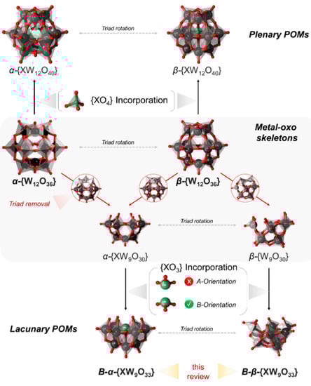 Concept map representation of the relationship between different metal–oxo skeletons (middle row) and the incorporation of tetrahedral guests {XO4} leading to complete plenary POMs (top row) or {XO3} guests leading to different lone pair containing lacunary POMs (bottom row). Color code: W = black, O = red X = green.