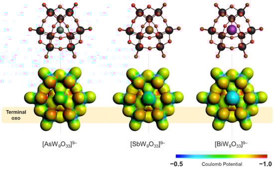 Ball-and-stick representation (top) and molecular electrostatic potential plotted over the density isosurface (bottom) of the three different trilacunary polyanions for qualitative comparison. Color code: As = green, Sb = brown, Bi = violet, W = black, and O = red. The most basic sites (bottom row) are shown with red coloring.