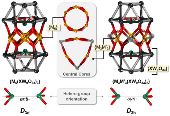 If the metal cations are partially protected with non-labile ligands, they typically coordinate and saturate the lacunary site of α-[XW9O33]9− POM, leading to metal-functionalized Janus-like nanomolecules. However, many transition metal cations deriving from simple metal salt precursors (e.g., chlorides, nitrates, etc.) can offer up to four coordination sites in square planar orientation and thus can interconnect two α-[XW9O33]9− units in an archetype that, due to historical reasons, is referred to as Hervé-type POM sandwich [48]. For a more profound discussion here, we describe the Hervé-type sandwich as a linear POM assembly where a cationic {M6−x} belt (x = 0–5) is sandwiched between two α-[XW9O33]9− units (see Figure 3). The {M6−x} belt connects to six formerly terminal–oxo ligands deriving from both α-[XW9O33]9− units. The {M6−x} is thus a part of a larger cyclic {M6−xO12} fragment in which when x = 0, all M-centered {MO4} square planes or square pyramids {MO4L} are in edge-sharing configuration with one another. In a scenario when the {M6−x} belt is fully saturated (i.e., x = 0), one formally distinguishes between two configurational isomers obtained because of the orientation of the {XO3} units. When both units {XO3} are oriented in an eclipsed fashion, the edge-sharing {WO6} octahedra from both α-[XW9O33]9− units are also eclipsed (i.e., syn). The eclipsing provides differences in interatomic d(O∙∙∙O) distances and enforces an ideal D3h symmetry point group. The syn orientation is thus dominant among inter-POM bridging with three metal centers. However, the remaining sites in a “saturated M6” scenario can often be occupied by metal cations with different coordination or ligand environments (e.g., alkali Na+ and K+).