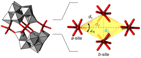 Referring to Figure 4, we generally distinguish between a- and b- site octahedra in the Krebs structure. As noted, the interatomic distance between two a-sites (i.e., d2) is ca. 10.0 Å, between two b-sites (i.e., d3) it is ca. 5.6 Å, and between an a and b site (i.e., d1) it is ca. 5.4 Å. Overall, d1, d2, and d3 are relatively large interatomic distances, and thus none or only very weak magnetic exchange interactions occur in this POM archetype [104,105].