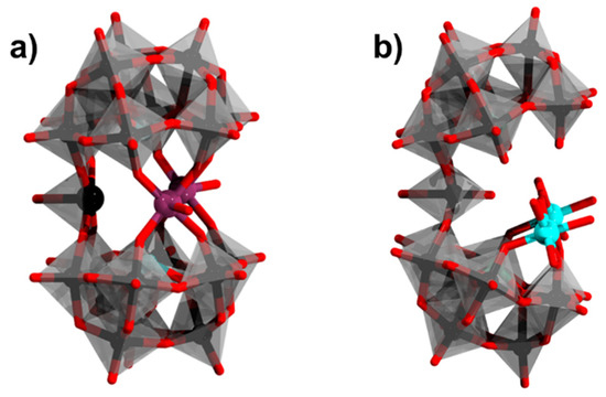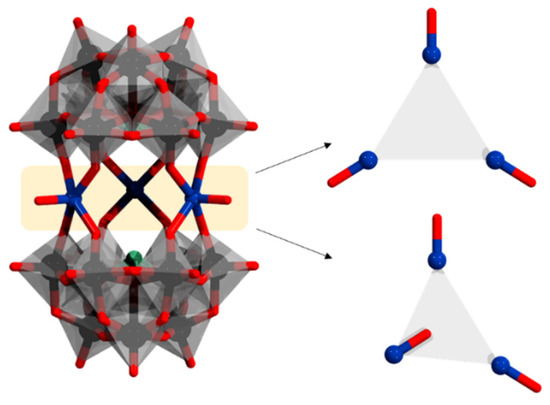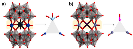 Similarly to [(M(H2O))3(α-AsW9O33)2]12− (M = MnII, CoII, NiII), Mialane and coworkers reported [(VO)3(α-AsW9O33)2]11−, featuring three cationic {VO} moieties [65]. Titration of the polyanion with CeIV revealed that [(VO)3(α-AsW9O33)2]11− is a mixed-valent {VIV2VV} species. The terminal oxo atoms lead to shorter metal–oxygen bond lengths ca. 1.6 Å, in contrast to when a terminal aqua ligand is bonded (ca. 2.0 Å). The vanadium derivative, however, showed significant disorder on two of the three metals linking the {α-AsW9O33} units. For these two vanadium atoms, the V = O bonds are directed alternatively towards the inside or the outside of the sandwich interior (Figure 7). Magnetic studies on the polyanions reveal anti-ferromagnetic interactions between the metal centers with coupling constants J = −2.9 cm−1.