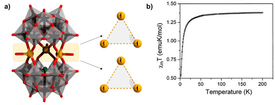 (a) Representation of [(Cu(H2O))3(α-SbW9O33)2]12− and depiction of the two spins triangles as ground and excited states on the three CuII sandwiched heterometals; (b) representative magnetic susceptibility plot (χmT vs. T at H = 1000) for {(Cu(H2O))3(α-XW9O33)2} (X = As, Sb, Se, and Te) reproduced with permission from reference [68] published by Wiley. Color code: X = green (but covered), M = brown, {WO6} = gray octahedra, W = black, and O = red. Hydrogen atoms from aqua ligands are omitted.