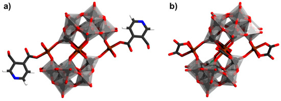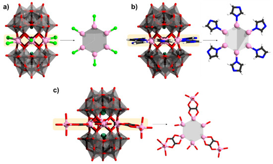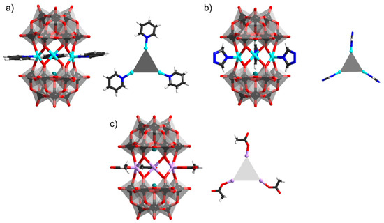 Termination with pyridine (pyr, C5H5N) has been manifested in the preparation of [(Ni(pyr))3(α-AsW9O33)2]12− polyanion (Figure 8a) [75]. In this polyanion, the terminal Ni−N bond distance is 2.016 Å, while the pyridine ligands lay in the same plane as the three heterometals. Magnetic susceptibility measurements have shown that the NiII cations are not fully equivalent, leading to ferromagnetic Ni∙∙∙Ni exchange as depicted by J = 6.17 cm−1. Similar to pyridine, functionalization with aminopyrazine (apyr) also forms products through direct coordination of nitrogen-atom with the metal, as manifested in the polyanion [(Ni(apyr))3(α-SbW9O33)2]12− [76]. In the latter antimonate derivative, the derived coupling constants J1 = −0.39 cm−1, J2 = −1.07 cm−1 are small and negative, indicating that the Ni∙∙∙Ni exchange interactions are weak anti-ferromagnetic [76].