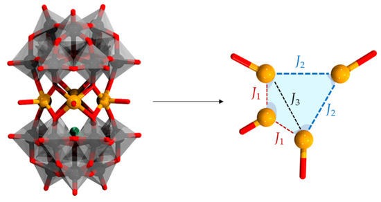 Polyanion [Cu4(H2O)4(α-AsW9O33)2]10− (left) and its {Cu}4 core (right) depicting three different couplings (J1, J2 and J3). Color code: As = green, Cu = orange, {WO6} = gray octahedra, W = black, and O = red.