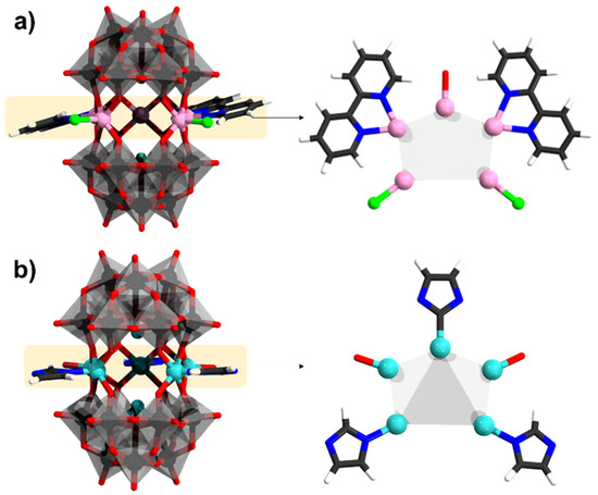 Furnishing the synthesis with bipyridine ligands can enforce symmetry break leading to structures with a syn arrangement of the α-[SbW9O33]9− units, which instead of three, encapsulate five metal centers. Two polyanions of the type [{Mn(bpy)}2(MnCl)3(AsW9O33)2]11− and [{Mn(bpy)}2(MnCl){Mn(OH2)}2(α-SbW9O33)2]9−, where X = As and Sb and bpy is bipyridine, have been reported [90]. The manganese centers are connected to bipyridine, chloride, and aqua ligand (Figure 11a). The Mn−N bond distance in the arsenic derivative is 2.25 Å, and the Mn–O bond distances are in the range of 2.08–2.24 Å. Magnetic studies on the polyanion show ferromagnetic interaction between the MnII ions. On the other hand, imidazole can also lead to an unusual binding and formation of metal-carbon bonds between CoII and NiII, leading to {Na0.7M5.3(OH2)2(imi)2(Himi)(α-SbW9O33)2} (Figure 11b), that has partial sodium occupancy [91].