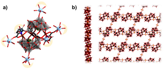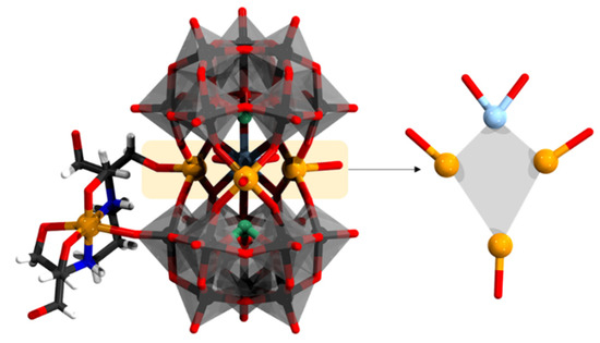 Polyoxometalates (POMs) represent a class of molecular metal oxides, typically comprised of early transition metals in high oxidation state(s) (mainly V, Mo, and W) [15,16]. POMs are one of the most complex of all-inorganic architectures [17], with broad applications in catalysis [18], materials science [19,20], and nanoelectronics [21,22]. Owing to their all-inorganic nature, high symmetry, and structural robustness, POMs have also been of high interest in molecular magnetism [23]. Plenary POMs exposing oxo-based cavities are typically used as scaffolds capable of stabilizing magnetic heterometallic cations, occasionally leading to single-ion magnets (SIMs) with spin qubit behavior [24,25]. Prominent examples are the lanthanide functionalized Preyssler POMs [23], and the cuboidal and pentagonal prismatic polyoxopalladates [21,26]. Some high symmetry, but partially or fully-reduced POMs, such as the semimetal-functionalized polyoxovanadates [27], mixed-metal Keplerates [28], are known to exhibit complex magneto-chemical behavior as well [29]. POMs with large internal cavities can exhibit multiple accessible oxo sites, successfully mimicking naturally occurring zeolites in incorporating multimetal magnetic nuclei [30], or even full metal–oxo clusters [31,32].