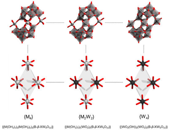 Interaction of α-[XW9O33]9− with heterometals (M) can lead to a wide range of structures differing in terms of POM ligands and interconnecting heterometal centers. As the trilacunary α-[XW9O33]9− are polydentate ligands, their combination with high-coordinate cations (e.g., lanthanides or actinides) can result in many possible connectives and occasionally in oligomeric POM assemblies with impressive tungsten nuclearities [56]. However, for improved synthetic and structural control, trilacunary α-[XW9O33]9− have often been reacted with transition metal cations that have more modest coordination numbers, ultimately leading to a lower number of connecting possibilities.