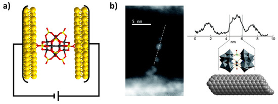 POMtronics is a term coined in 2020 [41] that broadly refers to advanced applications of POMs deriving from their magnetic, electronic, and optical properties [123]. In a more narrow sense, POMtronics refers to POM-based nanoelectronics and spintronic devices [124]. A typical example may be a symmetrical and spherical POM sandwiched between two gold electrodes functioning as a current switch (Figure 18) [124]. Spin-polarized POMs are of special interest for molecular junction as their current transport can be influenced without the need to employ an external magnetic field [125].