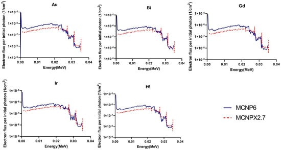 Calculated fluence and energy spectra of the generated Auger and photo electrons within the nanoparticle-loaded tumor during I-125 brachytherapy seed irradiation, exported from MCNPX (2.7) and MCNP6.1 outputs.