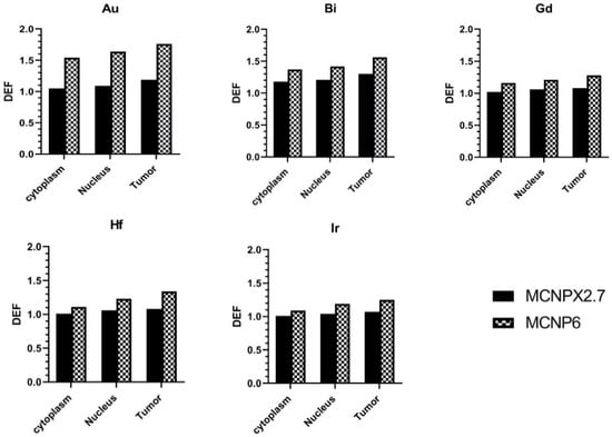 The DEF calculations in tumor tissue (macroscopic), and cytoplasm and nucleus of the cells (microscopic) are summarized in Figure 3, which shows an increased DEF (14–42%) in MCNP6.1 outputs comparing to the MCNPX (2.7). Moreover, it is clear that the DEF values are different for tumor tissue, and cytoplasm and nucleus of the tumor cells. In nanoscale dosimetry, the calculation of absorbed dose and DEF values can be affected by cutoff energy setting during the electron transport [,]. As mentioned before, unlike the MCNPX, MCNP6.1 is able to score the electrons with energy less than 1 keV and the discrepancy between the DEFs of two codes could be explained by the difference in exported electron spectra for the electrons lower than 25 keV shown in Figure 2. The MCNPX results are in good agreement with the results reported by Cho et al. []. Jones et al. [] used EGSnrc to directly obtain the spectra of generated secondary electrons. Their results showed that presence of gold nanoparticles during brachytherapy using I-125 X rays could leads to microscopic dose enhancement. Analytical and MC methods have been used to calculate the production of secondary electrons in terms of the DEF. MC results from Seniwal et al. [] study show that the use of different nanoparticles led to an increase in DEF up to 40%. The macroscopic dose enhancement of 40–70% was reported for I-125, Yb-169, and 50 kVp sources at presence of uniform gold nanoparticle concentration of 7 mg Au/g tumor [].