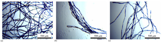 Optical microscopy (company, city, state, country) was performed on the various membranes by using a B-290 series microscope from Optika SRL (Ponteranica, Italy), to illustrate the structure of the cotton microfibers–CI/silver microparticle complex. First, the images of the pure cotton microfibers (M) are presented in Figure 3a and it can be seen that the average thickness is about 20 m. Second, the images of the cotton microfibers with honey and silver microparticles (M) show that the latter were attached to the cotton microfibers (Figure 3b). Finally, the images of the cotton microfibers with honey, silver, and CI microparticles (M) show that the latter were also attached to the cotton microfibers (Figure 3c).