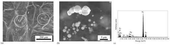 SEM and EDX data of the membrane with honey, CI, and silver nanoparticles (M). (a) 1—Cotton microfibers, 2—Honey with CI and silver microparticles. (b) Largest spheres—CI microparticles; smaller spheres—silver microparticles. (c) Elemental analysis.