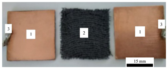 Figure 6. The components of the electrical device: 1—copper coated side of plates, 2—magnetizable CMs, 3—electrical connectors. The image was taken under different illumination conditions than those used for the image in Figure 4. - The membranes were placed between each of the two electroconductive plates. As such, the electrical devices ED with were obtained. Figure 7a shows the electrical device with membrane M.