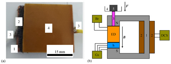 Figure 7. (a) Assembled electrical device: 1—copper-coated side of plates, 2—magnetizable CMs, 3—electrical connectors, 4—epoxy resin plate reinforced with fiberglass. The image was taken under the same illumination conditions as those used for the image in Figure 5. (b) The experimental setup used to measure the electrical properties of the device: 1—magnetic yoke with N and S poles, 2—coil, 3—non-magnetic spindle, 4—non-magnetic plate, 5—non-magnetic weight, DCS—continuous source current, Br—impedancemeter, Gs—gaussmeter, h—Hall probe, B—magnetic flux density vector, F—gravity force, ED—electrical device.