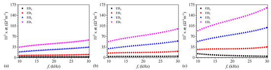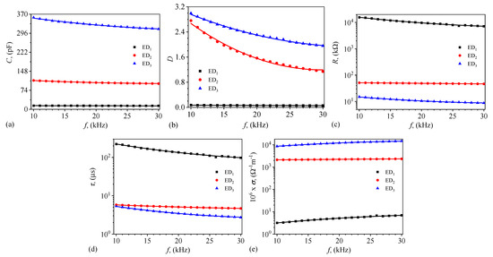 The results are shown in Figure 8e and reveal an increase of three orders of magnitude for ED, whereas for ED, the increase was about four orders of magnitude. In the investigated f-range, in all cases, the conductivity was quasi-constant.