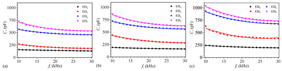 where L, l, and are the common length, width, and height, respectively, of the electrodes. In addition to Equation (1), the following relations for the electrical conductivity , capacitance C, and dielectric loss factor were used [38]: