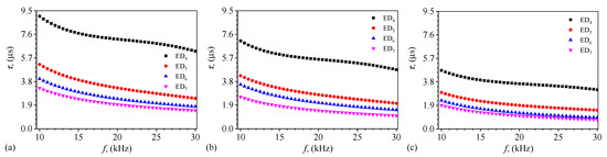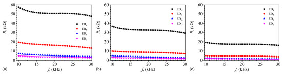 Using the data from Figure 10 and Figure 11 in Equation (3), one obtains the variations in the resistance with frequency f, as shown in Figure 12. The data show that the resistance decreased with the addition of the microparticles. In particular, the highest decrease was at mT, where the resistance of ED was about one order of magnitude smaller than that of ED. When , the differences between the resistances of ED and ED were less pronounced. Similar qualitative behavior also held for the time constant (Figure 13). Note that such behavior for the resistance and capacitance can be described qualitatively using models based on dipolar approximation [24].