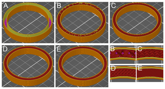 The samples were printed as circles (see Figure 1) with a diameter of 60/50 mm (outer/inner) and a height of 20 mm. This shape is conventional for samples used to determine the magnetic properties of ferromagnetic materials using the toroid measurement method [46,47,48,49,50]. A gyroid structure with an infill density of 0, 20, 50, 80, and 100% (Figure 1) was selected. Samples containing the additive were marked according to the filling, namely 0A, 20A, 50A, 80A, and 100A. The reference sample was prepared without any additive with 100% density filling and marked as 100F. The printing temperature was 235 °C, whereas the plate temperature was 85 °C. The 3D print speed was set to 70 mms−1. The layer thickness was 0.2 mm, extrusion width 0.4 mm, and skin thickness 0.6 mm—With 1 contour layer. A 3D nozzle with a hole diameter of 0.4 mm was used. Table 1 summarizes all relevant parameters (e.g., printing time and volumes) of the produced samples. At least two duplicates were produced for each sample type.